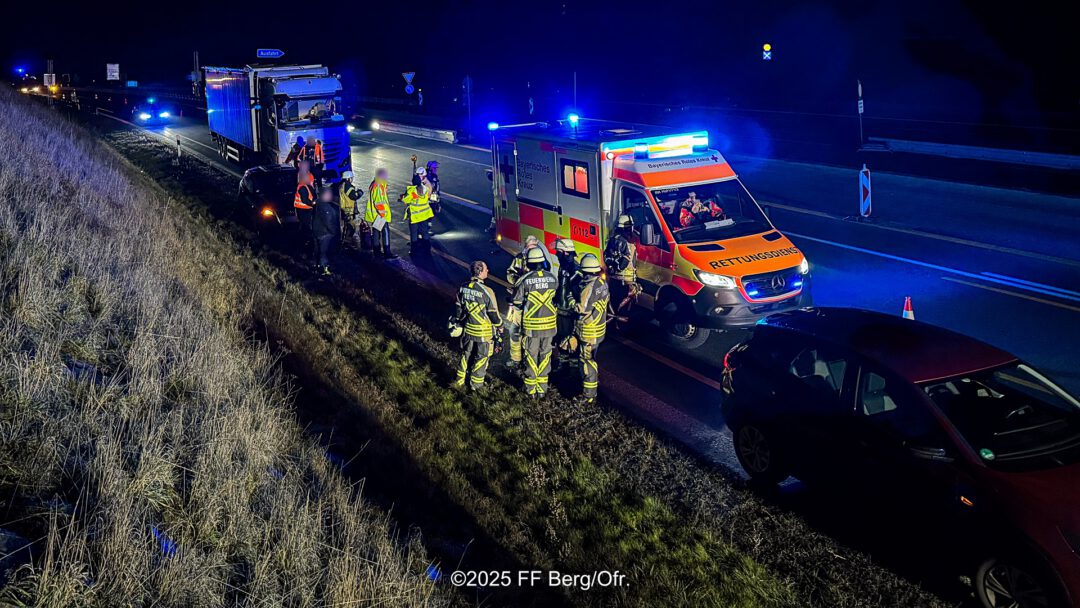 Im Baustellenbereich kollidierte ein PKW, nach der Kollision mit einem LKW, mit der Baustellen-schutzwand und kam anschließend im Bankett zum Stehen. Durch Feuerwehrsanitäter wurde die Fahrerin des PKW erstversorgt und bis zum Eintreffen des Rettungsdienstes betreut. Durch FL Berg 40/1 wurde der Brandschutz am Unfall-PKW sichergestellt und die Einsatzstelle mittels Lichtmast ausgeleuchtet. Durch FL Berg 42/1 mit VSA wurde der rechte Fahrstreifen bis zum Abtransport des PKW gesperrt.